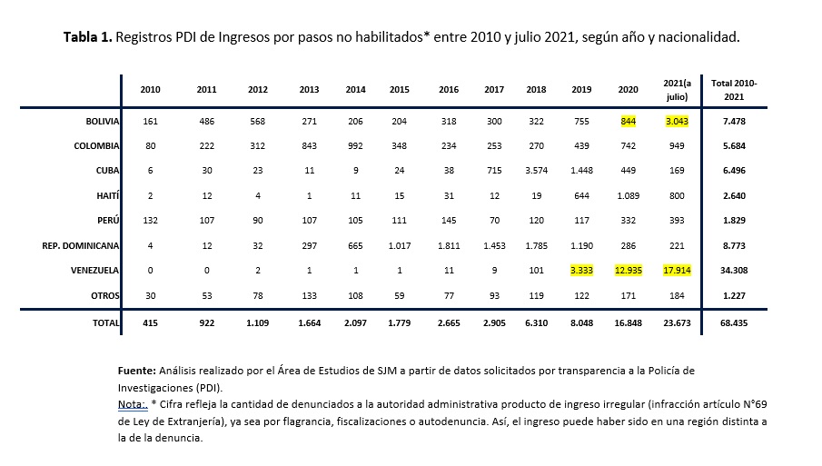 Servicio Jesuita a Migrante.- Las personas que han ingresado a Chile por paso no habilitado sólo desde enero a julio del 2021 ascienden a 23.673, según los datos entregados por la PDI al Servicio Jesuita a Migrantes a través de solicitud de Transparencia. Este aumento, se presenta en el contexto de medidas administrativas que restringen el acceso regular, intensificadas por el cierre de fronteras producto de la pandemia por Covid-19 y la crisis humanitaria y política en Venezuela y en otros países de la región como Haití.