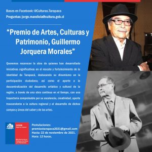 Un reconocimiento a la trayectoria y el legado que dejó quien fuera profesor y director de teatro, recientemente fallecido, Guillermo Jorquera Morales, es la instauración del premio regional y comunales, que llevará su nombre, al ser instaurado por el Ministerio de las Artes, las Culturas y el Patrimonio. La distinción “Premio de Artes, Culturas y Patrimonio, Guillermo Jorquera Morales”, destacará a todas aquellas personas que realizan un gran aporte en el ámbito cultural.