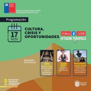 Entre el 16 y 18 de noviembre a la 17:00 hrs. se reunirán representantes de espacios culturales, cooperativas e instituciones vinculadas a la artes y el patrimonio a dialogar en torno a la conformación y consolidación del trabajo cultural en sus diversas áreas de desarrollo y vinculación con la comunidad. La instancia es posible mediante el financiamiento del proyecto Red Cultura del Ministerio de las Culturas, las Artes y el Patrimonio y ejecutada por la Red de espacios culturales autogestionados, Taqini Tarapacá.