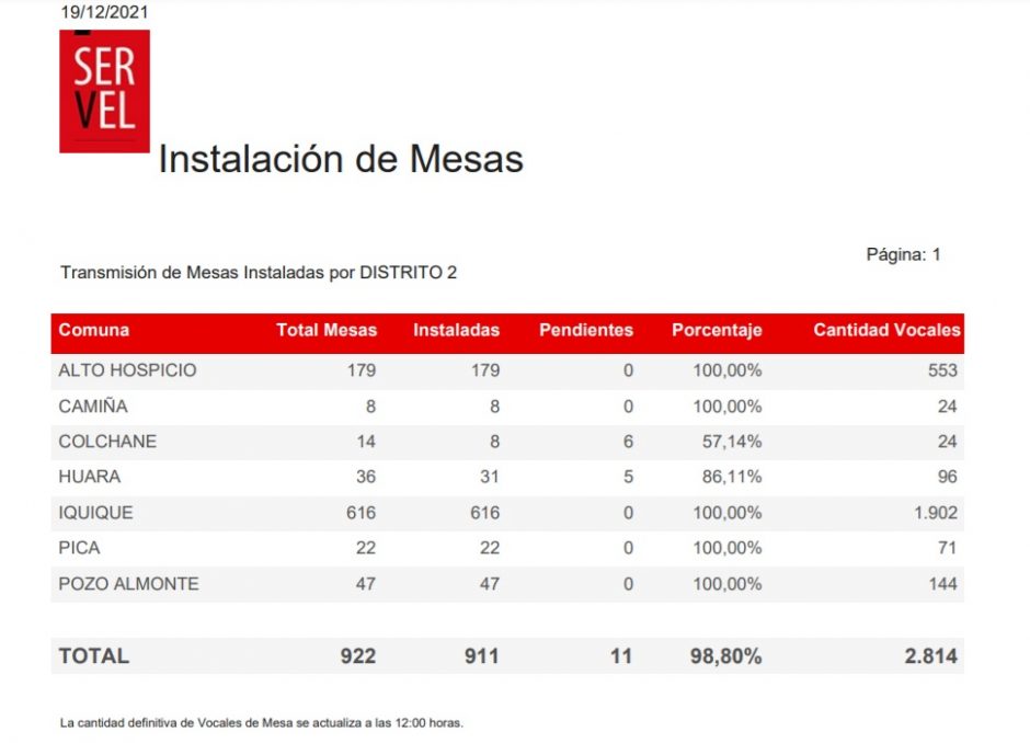 Antes del mediodía de este domingo de segunda vuelta, el 99.95% de las mesas constituidas en el país