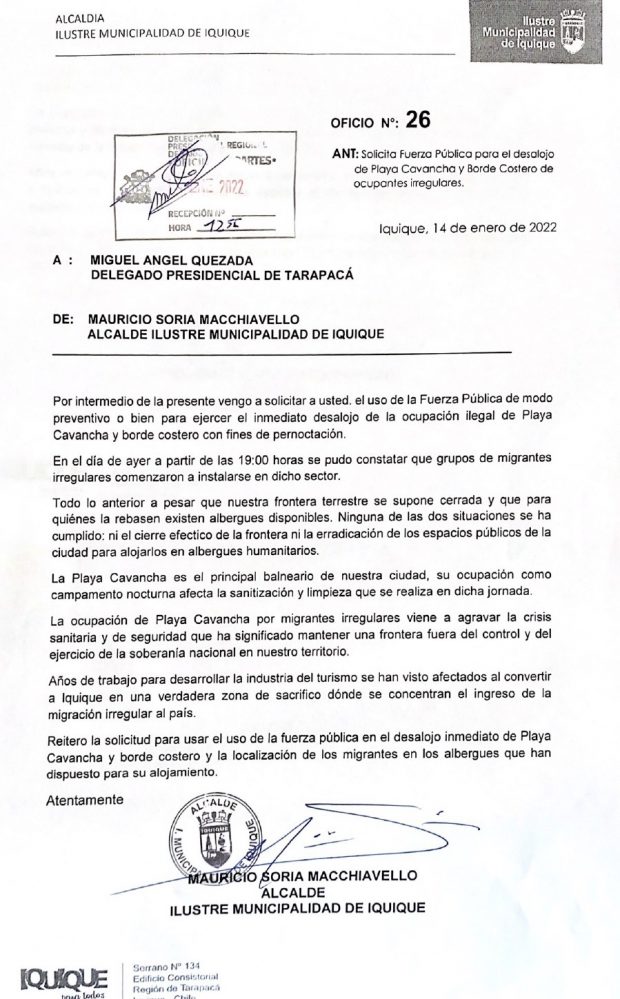 A partir de las 19:00 horas de este jueves 13 de enero, personal de la Municipalidad de Iquique constató que grupos de migrantes comenzaron a instalarse en Playa Cavancha para pasar la noche en el lugar, por lo que el alcalde Mauricio Soria Macchiavello envió un oficio al Delegado Presidencial Regional de Tarapacá, Miguel Ángel Quezada, solicitando hacer uso de la fuerza pública para desalojar a dichas personas.