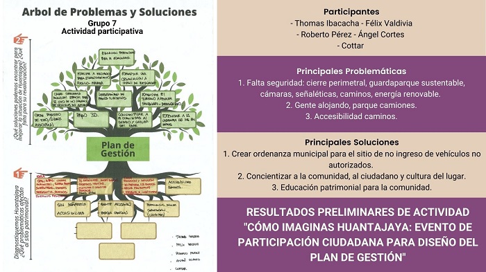 Una de las acciones realizadas por los participantes de la actividad participativa “¿Cómo imaginas Huantajaya?: Evento de participación para diseño del Plan de Gestión”, fue la confección, por grupos, de árboles de problemas-soluciones, herramienta que tiene como finalidad identificar las principales situaciones adversas de Huantajaya y que es muy importante para visualizar posibles acciones futuras.