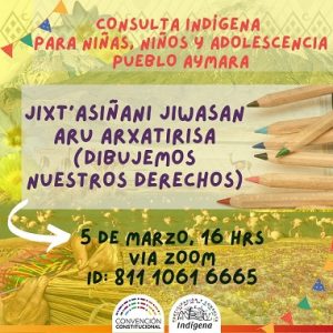 ¿Qué derechos para las niñas y niños aymaras deben estar en la nueva Constitución? Es una de las preguntas que responderán la infancia y adolescencia aymara que la Convención Constitucional convoca para este sábado 5 de marzo desde las 16.00 horas, vía plataforma Zoom, en una inédita Consulta Indígena “Jixt’asiñani Jiwasan Aru Arxatirisa”, Dibujemos Nuestros Derechos”, para las personas de 5 a 17 años de vida.