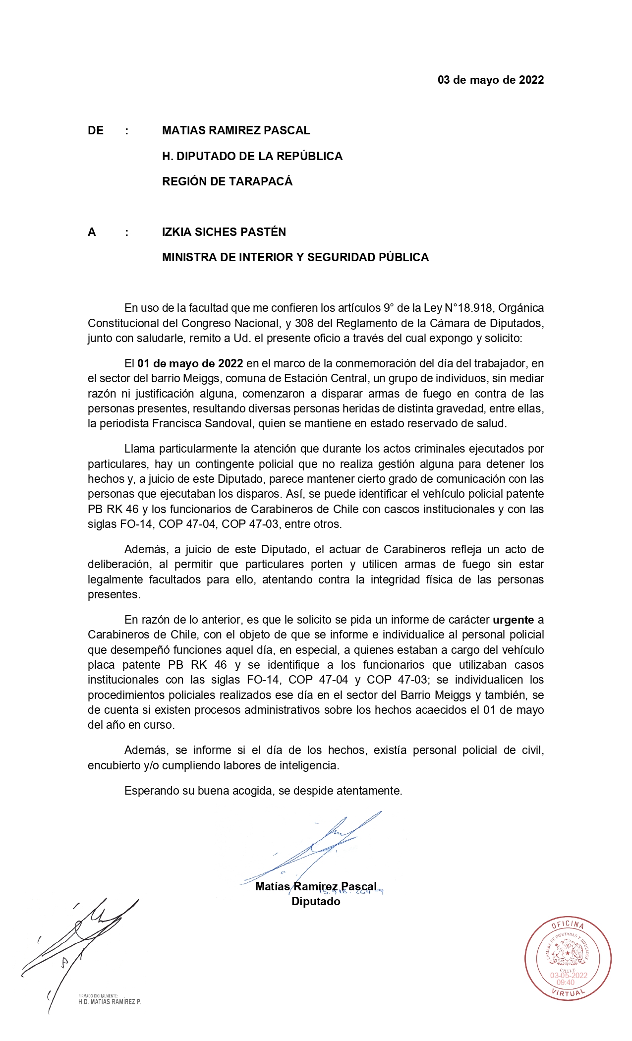Este martes el diputado PC, Matías Ramírez, ofició al Ministerio del Interior y Seguridad Pública, por la situación ocurrida el pasado 1 de mayo, en barrio Meiggs de la comuna de Estación Central, que terminó con al menos cuatro personas heridas. La acción pretenden también, esclarecer la relación de Carabineros con sujetos que porta un arma y cuya imagen se viralizó en redes sociales.