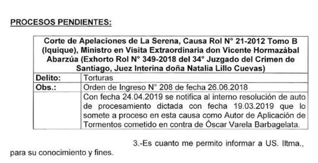En el mismo informe, el alcaide da cuenta de las condenas acumuladas, cumpliendo la primera, por 10 años y 1 día, condenado por el homicidio calificado contra el gendarme Isaías Higuera Zúñiga, por la Corte de Apelaciones de Iquique.