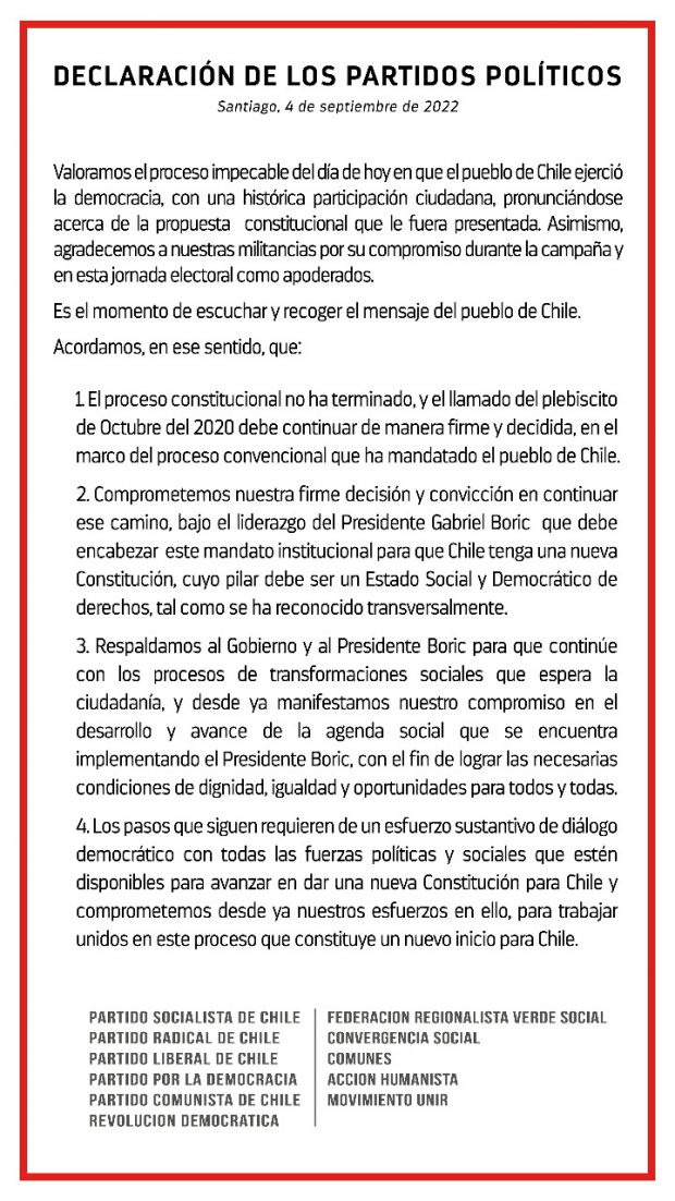 «Comprometemos nuestra firme decisión y convicción en continuar ese camino bajo el liderazgo del Presidente Gabriel Boric, que debe encabezar este mandato institucional para que Chile tenga una nueva Constitución, cuyo pilar debe ser un Estado Social y Democrático de Derechos…»
