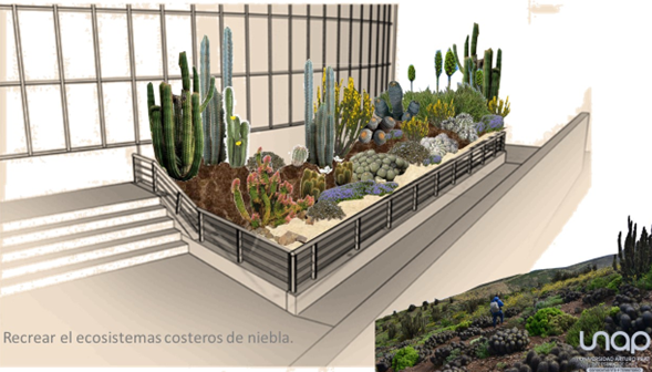 Esto permitió recrear la mayor diversidad de los ecosistemas de niebla que están presentes en toda la región de Antofagasta, proyecto que es coordinado por el Académico de la Facultad de Recursos Naturales Renovables de la UNAP, José Delatorre, junto a todo su equipo y las directrices de plantado ecosistémico del Arquitecto Paisajista Rodolfo Rojas Figueroa.