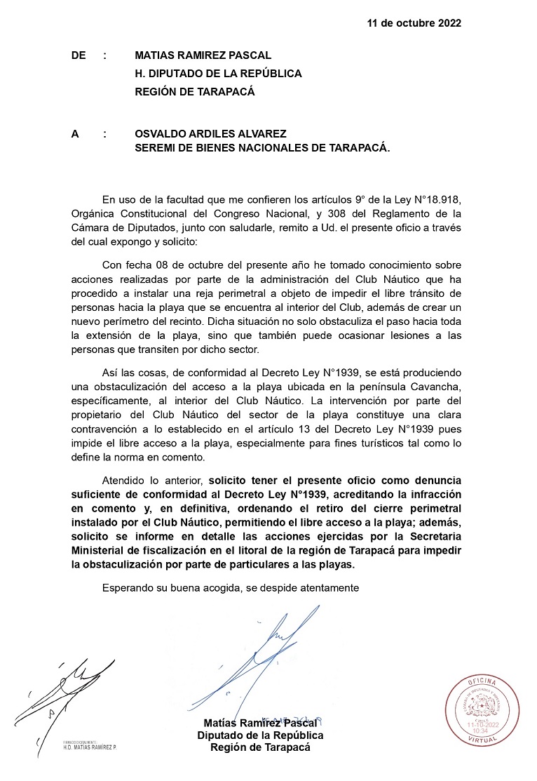 Las rejas fueron instaladas por la administración del Club Náutico, ubicada en esa zona turística de la ciudad. Motivo por el cual este martes, el diputado por Tarapacá, Matías Ramírez, ofició a la Secretaría Regional Ministerial de Bienes Nacionales, para denunciar y determinar las responsabilidades de la administración del recinto al bloquear el acceso a la playa, lo que atentaría contra el artículo Nº13 del Decreto Ley N°1939.