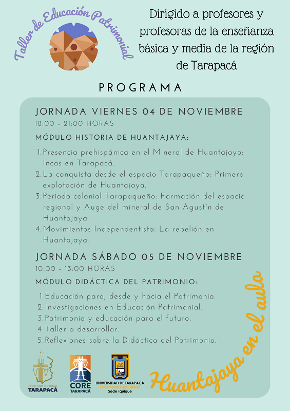Ya se encuentran abiertas las inscripciones para participar del taller de Educación Patrimonial “Huantajaya en el aula”, iniciativa que busca llegar a profesores y profesoras de educación básica o media, de todo tipo de especialidad, interesados en temáticas patrimoniales e históricas.
