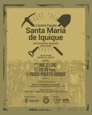 Casi en forma paralela, y a partir de las 20.30 horas de este miércoles 21 de diciembre, se realizará la presentación de la Cantata Santa María de Iquique, del compositor Luis Advis., en el Paseo Puerto de Iquique (EPI)
