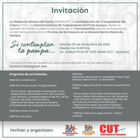 En la ocasión se realizará un conversatorio, centrado en dos temas centrales asociados a la Masacre. El primero, Iquique y su entorno en 1907, conflictos sociales y organización obrera; el segundo, “Mujeres y Acción Política en el Movimiento obrero clásico”. Además habrá teatro y música en vivo para conmemorar esta fecha.