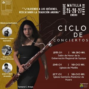 Para cerrar su proyecto “Perfeccionamiento de Interpretación en Fagot con la maestra Florencia Fogliati”, la instrumentista Tamara Cortés Araya, realizará conciertos en Iquique, Matilla y Huara. Se trata de una iniciativa de rescate de las raíces, para volver a la tradición aymara.