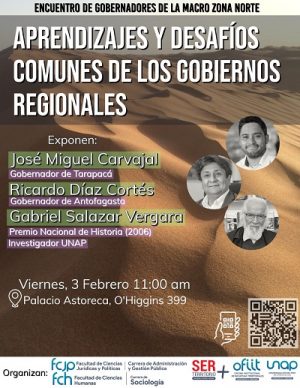 En este evento organizado por la Facultad de Ciencias Jurídicas y Políticas, y su nueva carrera de Administración y Gestión Pública; y la Facultad de Ciencias Humanas, con su carrera de Sociología, participarán los gobernadores de las regiones de: Arica y Parinacota, Jorge Díaz Ibarra; Tarapacá, José Miguel Carvajal; Antofagasta, Ricardo Díaz Cortés. Además, el evento será integrado por el Premio Nacional de Historia, y académico UNAP, Dr. Gabriel Salazar Vergara.