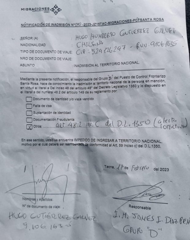 Acá dejamos la notificación que recibió Hugo Gutiérrez, de inadmisión a la República del Peru, cuando intentaba cruzar la frontera a través del Complejo del Puesto de Control Fronterizo Santa Rosa.