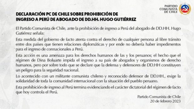 Ante la inadmisión de Gutiérrez a territorio peruano, el Partido Comunista, del cual es un histórico militante,   se pronunció mediante una declaración pública, señalando que: