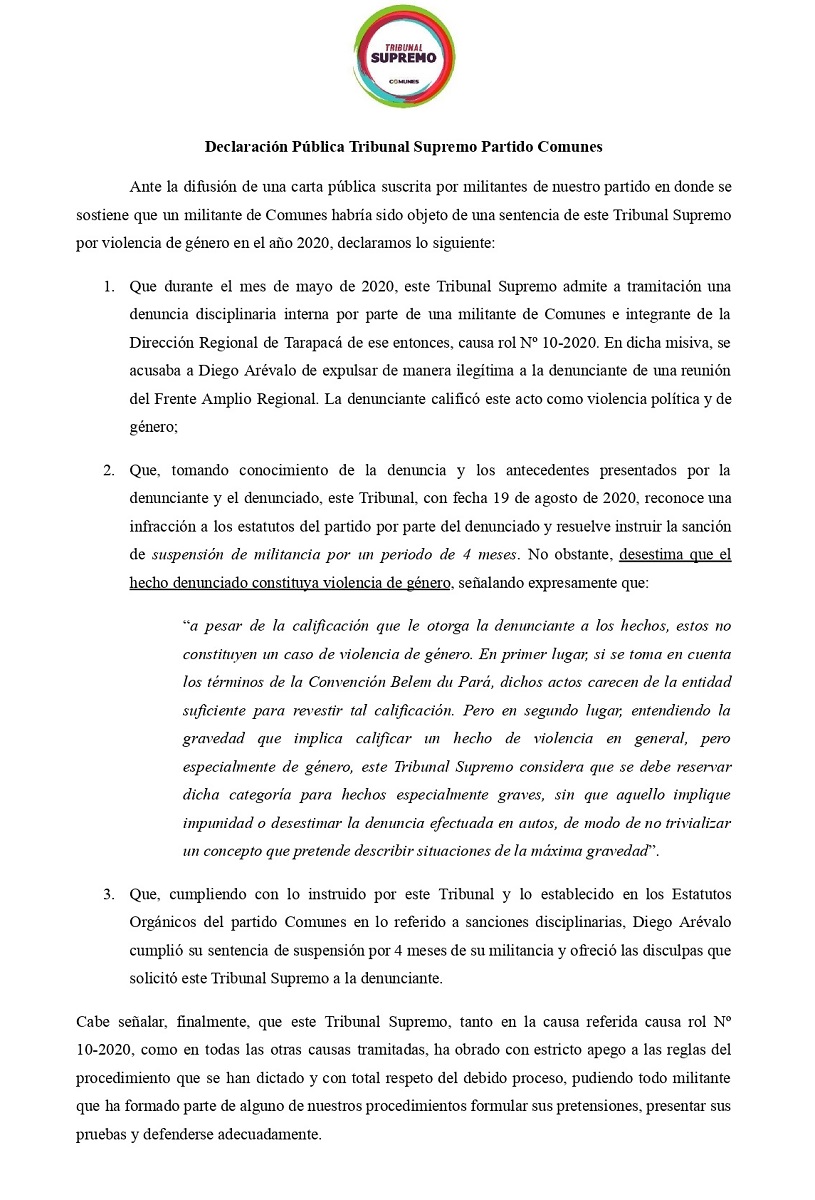 Que el actual Seremi de Gobierno, en su militancia política, fue sancionado y su militancia suspendida por 4 meses, pero no por la causal de violencia de género, que no se configuró, señaló mediante una declaración pública, el Tribunal Supremo del Partido Comunes. La instancia debió pronunciarse, luego que un grupo de sus adherentes, la mayoría autoridades electas en elección popular, pidieran la renuncia de Diego Arévalo al cargo, invocando una supuesta sanción por violencia de género, afectando a otra integrante de ese partido.