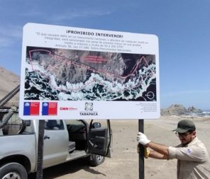 Esta semana una cuadrilla integrada por funcionarios de ambos organismos, se dirigió hasta el Pabellón de Pica y Huanillos donde se instalaron dos señaléticas que informan acerca de las penas a las que se exponen quienes causen daños en estos monumentos históricos.