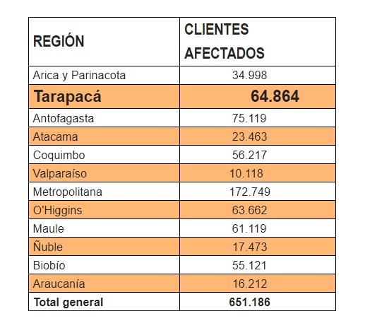 Más atrás se ubican Coquimbo (56.217 clientes afectados) y Biobío (55.121 clientes afectados, Arica y Parinacota (34.998), Atacama (23.463), Ñuble (17.473), Araucanía (16.212) y Valparaíso (10.188).