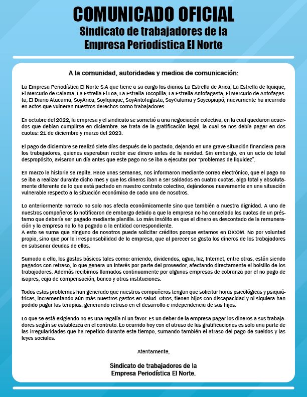 El Sindicato de trabajadores y trabajadoras de la Empresa Periodística El Norte, que agrupa a varias de la cadena de El Mercurio, acusa públicamente actos que nuevamente se vulneran los derechos de los trabajadores, pese a acuerdos mínimos logrados en medio de un proceso de negociación colectiva, en octubre del año pasado.
