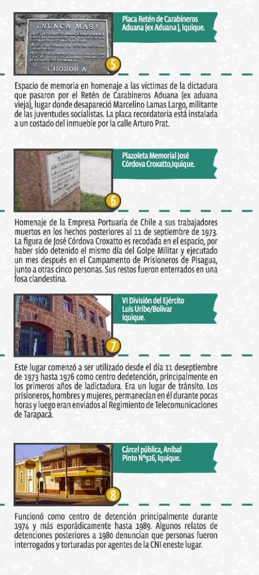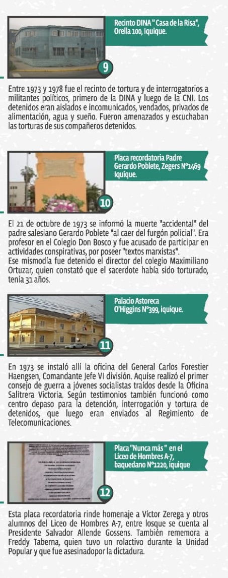 La Ruta de la Memoria, que dispondrá de locomoción para los desplazamientos, los que ya están pre definidos, con delegaciones de jóvenes estudiantes, tanto de enseñanza media como universitarios. Se recorrerá doce sitios de memoria ubicados en Iquique, como centros de detención y memoriales cuyos lugares dejaron huellas de la brutalidad de la dictadura cívico militar.