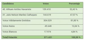 Sobre un universo total de 38.476 mesas receptoras de sufragios instaladas, con un total de 38.216 que equivale al 99,32% de las mesas escrutadas totales para la Elección Consejo Constitucional Indígena, los votos válidamente emitidos, esto es, excluidos los nulos y en blanco, los resultados preliminares son los siguientes: