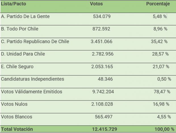 Sobre un universo total de 38.665 mesas receptoras de sufragios instaladas, correspondiente a 16 circunscripciones senatoriales, con un total de 38.448 que equivale al 99,44% de las mesas escrutadas totales para la Elección del Consejo Constitucional, los votos válidamente emitidos, esto es, excluidos los nulos y en blanco, los resultados preliminares son los siguientes según informó el Servel: