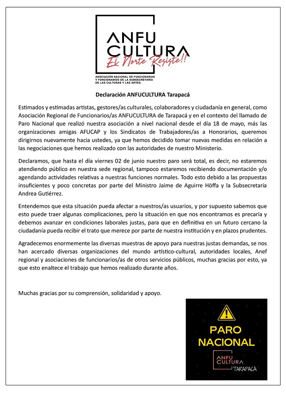 Ante la insuficiente respuesta del Ministro de las Culturas, Jaime de Aguirre y de la Subsecretaria Andrea Gutiérrez, los funcionarios de la Seremi de las Cultura de Tarapacá, agrupado en AnfuCultura, iniciaron a contar de este miércoles 31 de mayo y hasta el viernes 2 dejunio, un paro total, sin atención de emergencia, que es lo que se conoce como «turnos éticos».