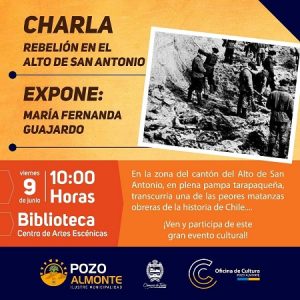 La presentación de la historiadora, está basada en el libro que publicó Rebeldía en el Alto San Antonio. Huelga, represión y muerte en la oficina salitrera la Coruña, 1925, el cual realizó en el marco de una investigación científica, aportando con inéditos antecedentes.