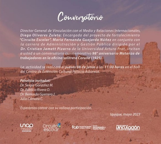 En tanto en Iquique, la Universidad Arturo Prat, también realizará un conversatorio sobre este tema de memoria obrera, a las 18.00 horas de este jueves 8, en dependencias del Palacio Astoreca, con la participación de la historiadora María Fernanda Guajardo, teniendo como panelistas al Premio Nacional de Historia 2014, Sergio González; a Bernardo Guerrero y a Julio Cámara Cortes, gestor de varias de las iniciativas que se han realizado en Iquique con anterioridad, en torno a esta masacre obrera.