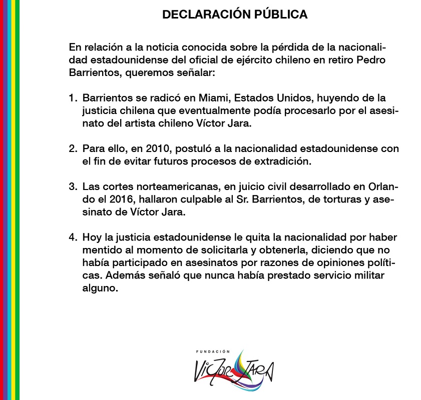 Así se expresa mediante un comunicado, donde además se indica que el exmilitar se fue a EE.UU huyendo de la justicia chilena y en el 2010 logra la nacionalidad estadounidense para evitar futuros procesos de extradición. Sin embargo hoy ya no tiene ese respaldo, al no poseer ya, la nacionalidad estadounidense.