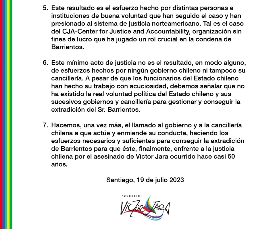 Y concluye, haciendo un llamado «al gobierno y a la cancillería chilena a que actúe y enmiende su conducta, haciendo los esfuerzos necesarios y suficientes para conseguir la extradición de Barrientos para que éste, finalmente, enfrente a la justicia chilena por el asesinado de Víctor Jara ocurrido hace casi 50 años».
