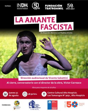 “La Amante fascista”, obra audiovisual realizada por Vicente Sabatini y escrita por Alejandro Morreno, se presentará el próximo, jueves 31 de agosto, a las 18.30 horas, en el Centro Cultura de Alto Hospicio, actividad que se enmarcan en la agenda conmemorativa por los 50 años del golpe de Estado en Chile.