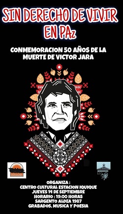 En conmemoración de los 50 años de la muerte de Víctor Jara, cuya voz fue acallada por la dictadura con 144 balas, el Centro Cultural Estación Iquique, realizará la jornada cultural y de reflexión, «Sin derecho de Vivir en Paz», título que parafrasea uno de los temas más emblemáticos del artista.