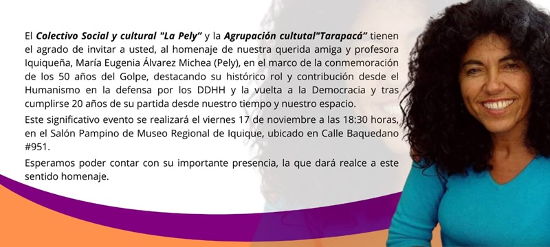 Un sentido Homenaje a quien fuera la recordada y destacada profesora Iquiqueña y dirigenta Humanista, María Eugenia Álvarez Michea, (1955- 2003) ,realizarán el «Colectivo Social y Cultural La Pely» y la histórica Agrupación Cultural Tarapacá, quienes extienden la invitación a la Comunidad, para que sea parte de este espacio de homenaje, recuerdo y reflexión.