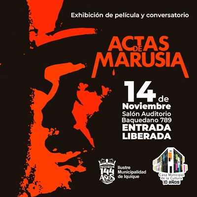 En ese contexto, es que, en la Casa Municipal de la Cultura de Iquique, se exhibirá la película «Las actas de Marussia» de Miguel Littin y Patricio Manns, seguida de un Conversatorio sobre los sucesos ocurridos en la pampa de Tarapacá.