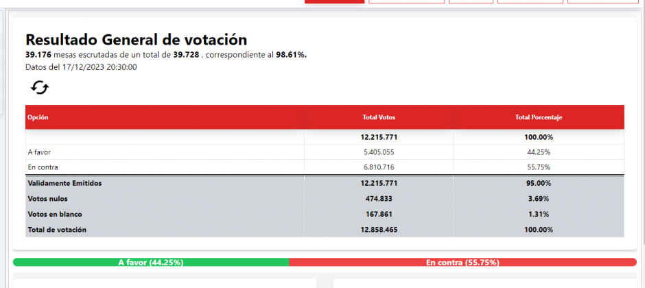 Con más del 98% de las mesas escrutadas, se impone el triunfo de la opción «En Contra», a nivel país, que logra el 55.75, mientras que el «A Favor», obtiene el 44.25 por ciento de las preferencias.