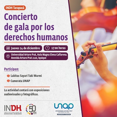 Una actividad en conjunto, en el contexto de los actos conmemorativos por los 50 años del golpe civil y militar, realizarán el Instituto de Derechos Humanos de Iquique y la Universidad Arturo Prat. Se trata de un Concierto de Gala por los Derechos Humanos, programado para el próximo jueves 14 de diciembre, a las 17.00 horas, en el Aula Magna de la UNAP.