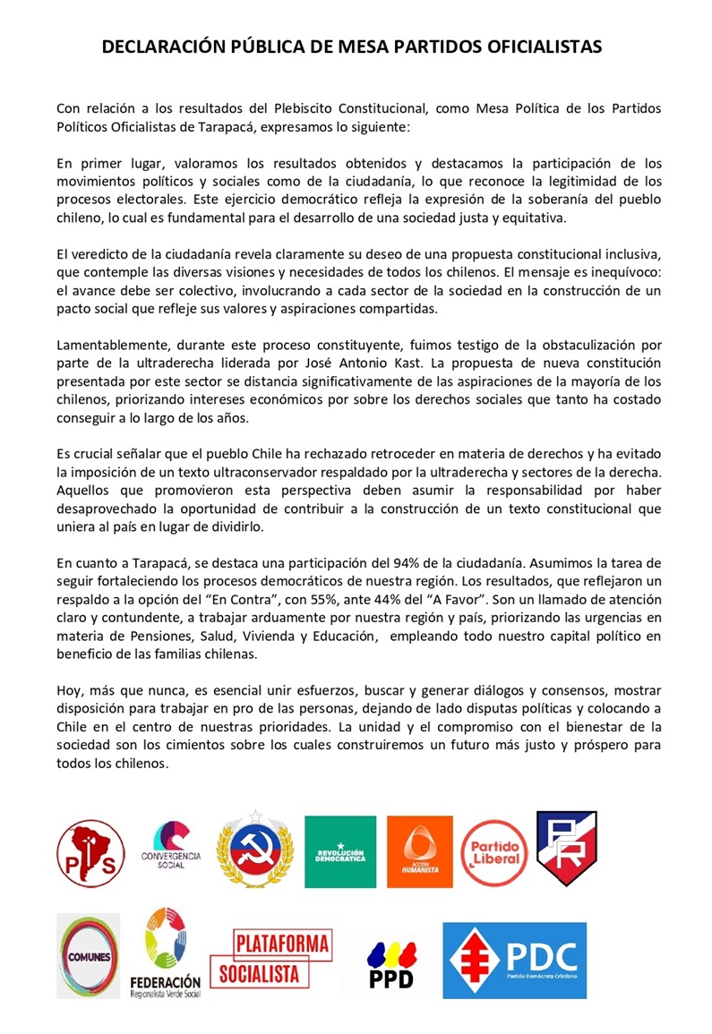 Mediante una declaración pública, la Mesa de Partidos Políticos Oficialistas de Tarapacá, se expresó respecto del reciente plebiscito, en el que se votó En Contra, de la propuesta constituyente, que impulsó la derecha y que lideró el Partido Republicano. «La propuesta de nueva constitución presentada por este sector se distancia significativamente de las aspiraciones de la mayoría de los chilenos, priorizando intereses económicos por sobre los derechos sociales que tanto ha costado conseguir a lo largo de los años», dice parte de la declaración.