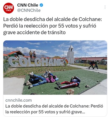 Su profundo malestar y rechazo ante la forma en que el canal de televisión CNN Chile ha cubierto el accidente automovilístico ocurrido en la presenta jornada y que involucró al alcalde, Javier García Choque, expresó la Municipalidad de Colchane, donde el medio ironiza que el edil sufrió doble tragedia: «Perdió la elección por 55 votos y sufrió grave accidente de tránsito»