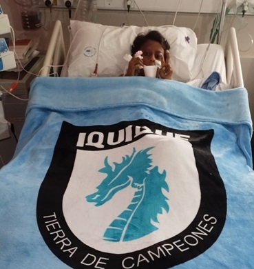 Feliz con su manta del Club de Deportes Iquique, lucia Felipe en el hospital Calvo Mackenna, a la espera de un donante. El órgano llegó y la intervención fue realizada en el Hospital Clínico de la Universidad Católica.