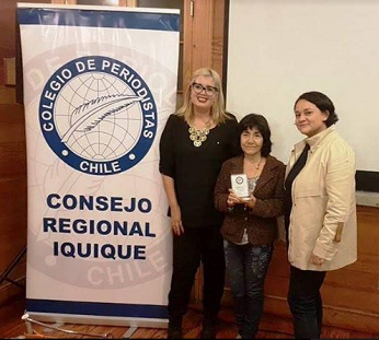 Dora en el 2017, recibiendo el premio a la Trayectoria Periodística. Le acompañan Daniela Oñate y Loreto Martínez. Foto del Archivo de Edición Cero.