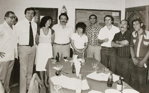 Aniversario del Diario La Estrella de Iquique, en 1982. Aparecen Hernán Cortés Heredia, Manuel Márquez, Roshi Biagetti, Enrique Jorquera -Director-, el «flaco» Reyes, Ricardo Herrera, (no tenemos el nombre del que sigue) y Bacilio. Foto del archivo de Ricardo herrera