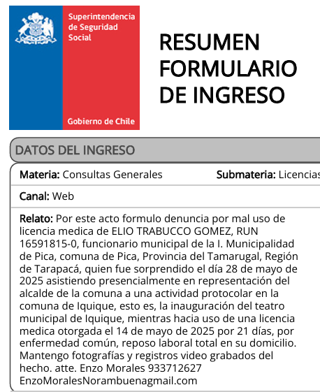 “Por este acto formulo denuncia por mal uso de licencia médica de ELIO TRABUCCO GOMEZ, RUN 16591815-0, funcionario municipal de la I. Municipalidad de Pica, comuna de Pica, Provincia del Tamarugal, Región de Tarapacá, quien fue sorprendido el día 28 de mayo de 2025 asistiendo presencialmente en representación del alcalde de la comuna a una actividad protocolar en la comuna de Iquique”