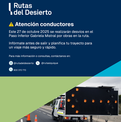 Junto con las medidas operativas, la Sociedad Concesionaria ha desarrollado una campaña comunicacional orientada a sensibilizar a los principales actores que transitan por la ruta, incluyendo conductores de transporte de carga sobredimensionada, camiones, buses, vehículos particulares, así como la comunidad de Alto Hospicio e Iquique, principalmente. Esta iniciativa busca concientizar respecto de la importancia de respetar las normas de tránsito y las restricciones implementadas, para evitar accidentes y reducir el impacto de las obras en la movilidad cotidiana.