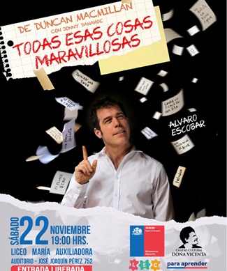Una invitación a las familias y comunidades educativas de la región de Tarapacá a presenciar la obra de teatro «Todas esas cosas maravillosas» que el actor Álvaro Escobar, realizó la Seremi de Educación Carolina Vargas Bruna. La pieza teatral se pondrá en escena este sábado 22 de noviembre a las 19 horas en el auditorio del Liceo María Auxiliadora de Iquique, ubicado en la intersección de las calles José Joaquín Pérez con Barros Arana, comuna de Iquique.