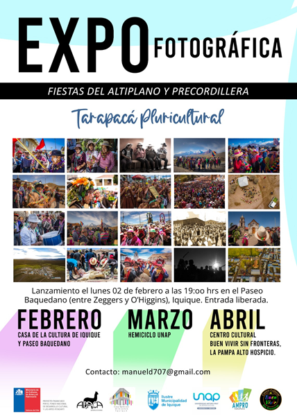 La segunda edición de Tarapacá Pluricultural expondrá una muestra fotográfica sobre las festividades de Precordillera y Altipano de la región. La Exposición busca irrumpir el espacio público con fotografías de gran tamaño (1,20 m x 1,80 m), e iniciará su recorrido en el Paseo Baquedano donde se realizará su lanzamiento el próximo lunes 02 de febrero a las 19:00 horas, entre Zegers y O’Higgins.
